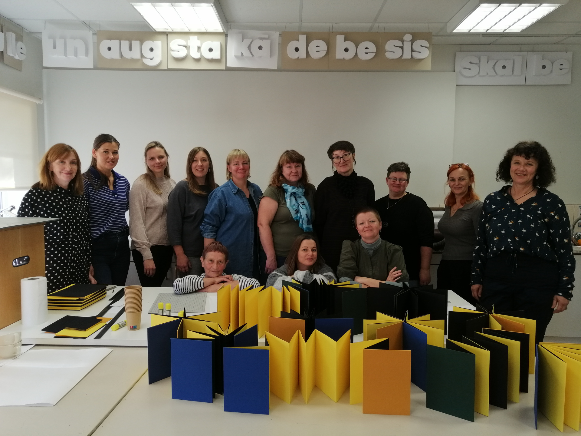 Kursi sniedza teorētiskās zināšanas par grāmatas kā objekta veidošanas pamatprincipiem, tehnisko paņēmienu daudzveidību un to izmantošanas iespējām mākslas nodarbībās. Nodarbībās ieguvām praktiskas iemaņas darbā ar papīru un kartonu, tā iepazīstot vienu no daudzveidīgākajām grāmatu mākslas tehnikām AKORDEONA sējumu veidu.